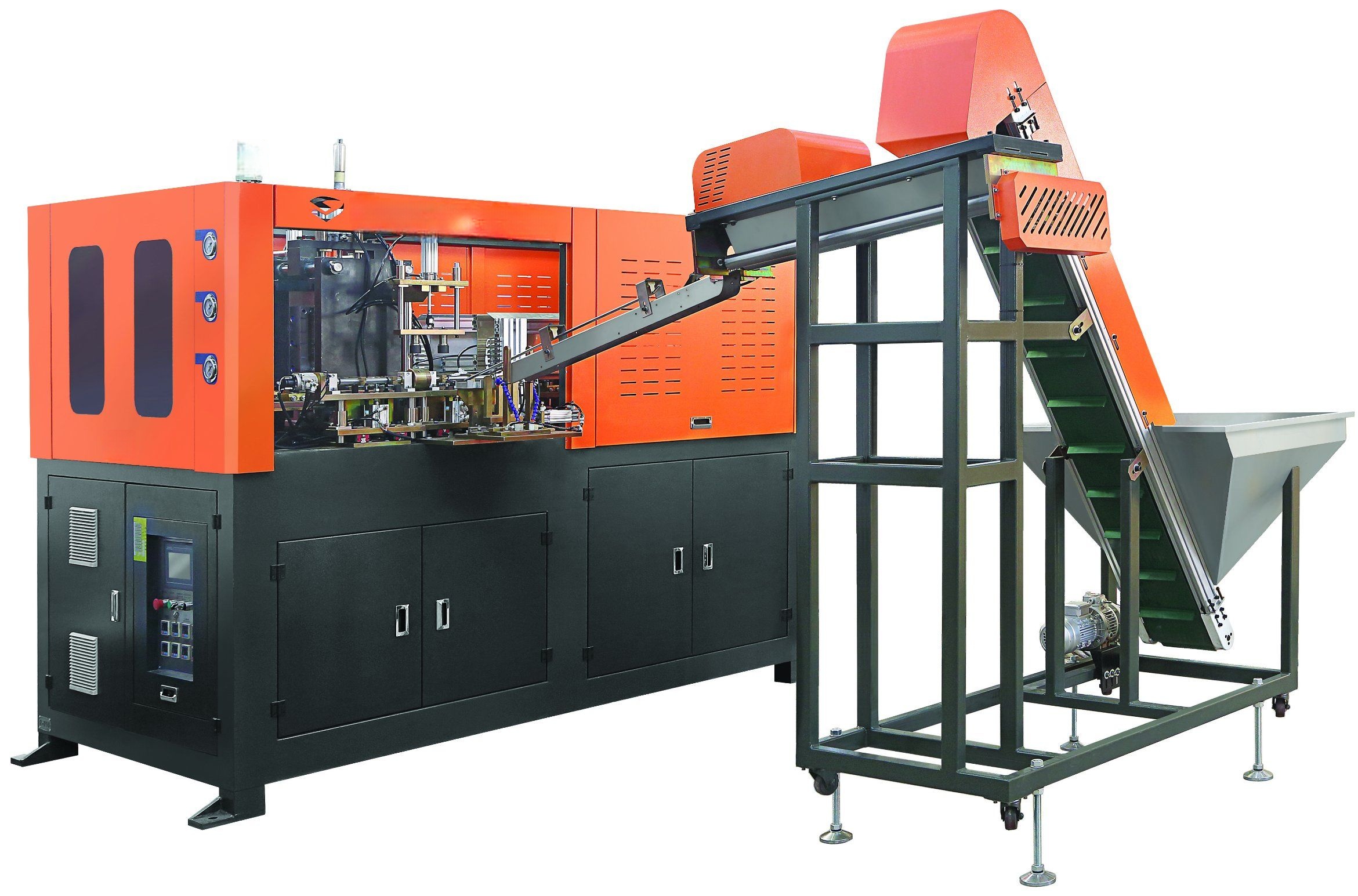 Двухшаговый линейный автомат выдува ПЭТ-бутылок из готовых преформ. Преформы загружаются автоматически, нагреваются в ИК-печи и раздуваются сжатым воздухом в 2-гнёздной форме. Полностью автоматический цикл, оператор только контролирует подачу преформ и выгрузку. Идеально для малого производства воды, сока, масла, химии.