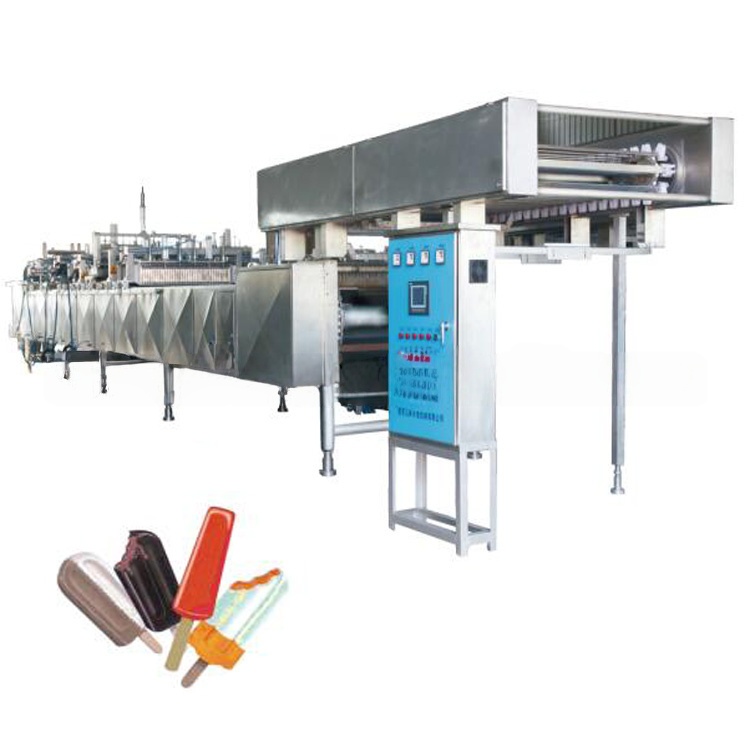 Полуавтоматическая линия для производства мороженого эскимо на палочке — порционного мороженого с глазурью или без. Оборудование обеспечивает полный цикл: приготовление смеси, фризерование, формовка в рассольной ванне, вставка палочек, глазирование. Формовочная машина линейного типа с рассольным охлаждением — дозатор заливает смесь в формы, рассол замораживает, палочки вставляются автоматически, дефростер освобождает изделие, экстрактор переносит на глазировочный участок. Для мини-заводов и сезонных производств.