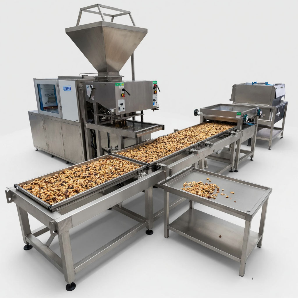 Автоматизированная линия для производства мюсли-батончиков на основе овсяных хлопьев, орехов, сухофруктов и связующих компонентов (мёд, сироп, патока). Оборудование обеспечивает полный цикл — от смешивания ингредиентов до упаковки готового продукта. Предназначена для малых и средних пищевых производств, ориентированных на рынок здорового питания.