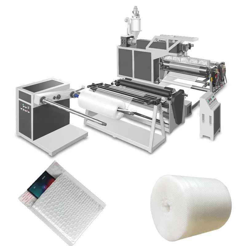 Экструзионная линия для производства воздушно-пузырьковой плёнки (bubble wrap) методом термоформования. Расплавленный полиэтилен экструдируется через плоскощелевую головку, формуется на вакуумном барабане с образованием воздушных камер и ламинируется вторым слоем плёнки. Готовая плёнка сматывается в рулоны заданного диаметра.