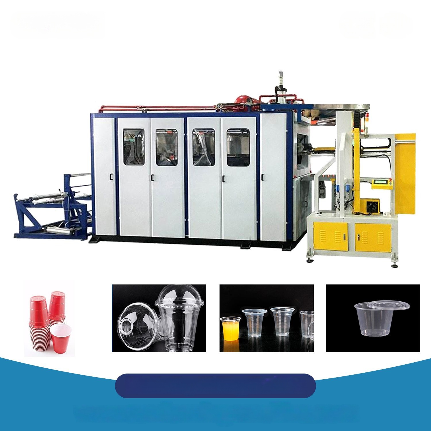 Полностью автоматическая термоформовочная машина кулачкового типа. Рулон ПП/ПС/ПЭТ-листа → нагрев → формование + вырубка в одной станции → штабелирование готовых стаканов. Обрезь автоматически уходит в гранулятор и возвращается в сырьё. Оператор только заряжает рулон и упаковывает стаканы.